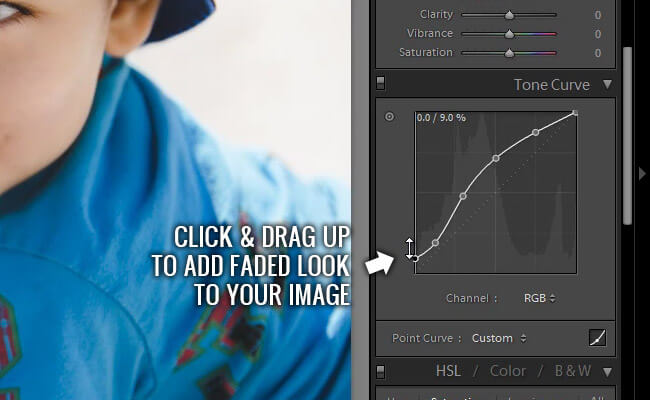 To do this, simple click on the bottom corner point and drag up. The higher you drag the more faded or washed out your image will become. This is a great effect if you’re going for a vintage style old film look. You can also add more fade by pulling the white point (the one at the very top right corner) down, and this will add more of a fade to the Highlights of your image.