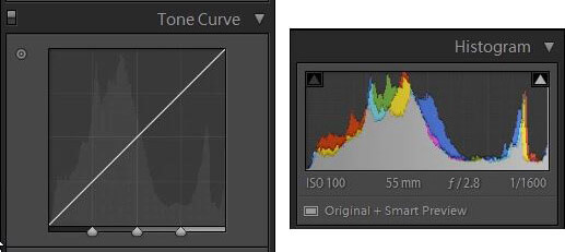 When we look at the Lightroom Tone Curve, we see that it looks very similar to the Histogram. They both graph a visual representation of our image. The difference? What we see in the Tone Curve is just luminosity, whereas in the Histogram also shows us colors.