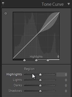 Underneath the Lightroom Tone Curve is the Regions, and here we can adjust Highlights, Lights, Darks, and Shadows. It works similarly to the sliders in the Basic Panel, and when we mouse over a Region’s slider we can see where it’s affecting the Tone Curve.