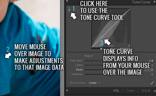 Another quick way that you can edit your image using the Lightroom Tone Curve is through the Tone Curve Adjustment tool. It works similarly to a color picker, you just move your mouse over sections of the image and the tool highlights the area on the Tone Curve where that section of the image is. Then to adjust you just click and drag up or down to make that area of the image brighter or darker.