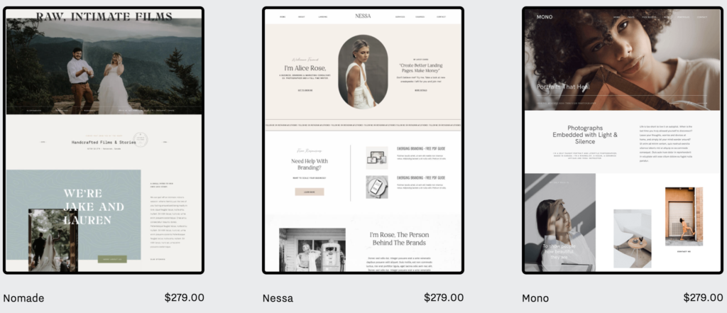 - Nomade – “Elise is a light, romantic website theme with a modern editorial twist. Its refined typography and delicate design elements will perfectly support those who want a minimalistic portfolio layout, with an in-depth narrative. Elise is perfect for wedding, fine art, editorial, film, family or portrait photographers, as well as planners, bridal designers, etc.”