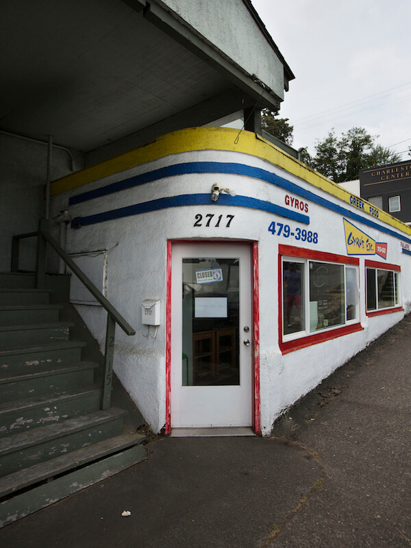 The curving lines and bright colors of this gyro shop stand in contrast to the more traditional wood construction of the building it’s ostensibly a part of.