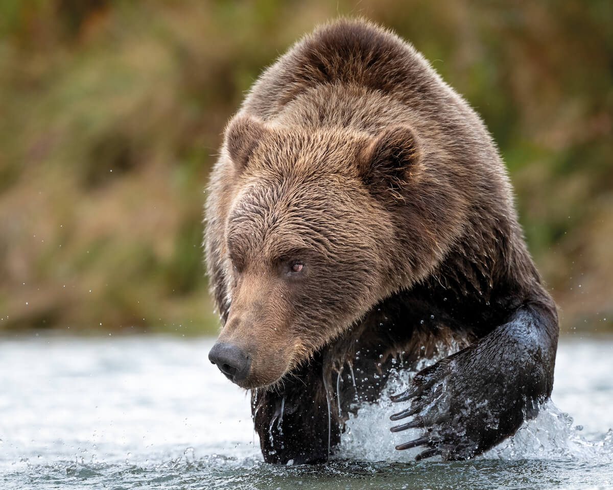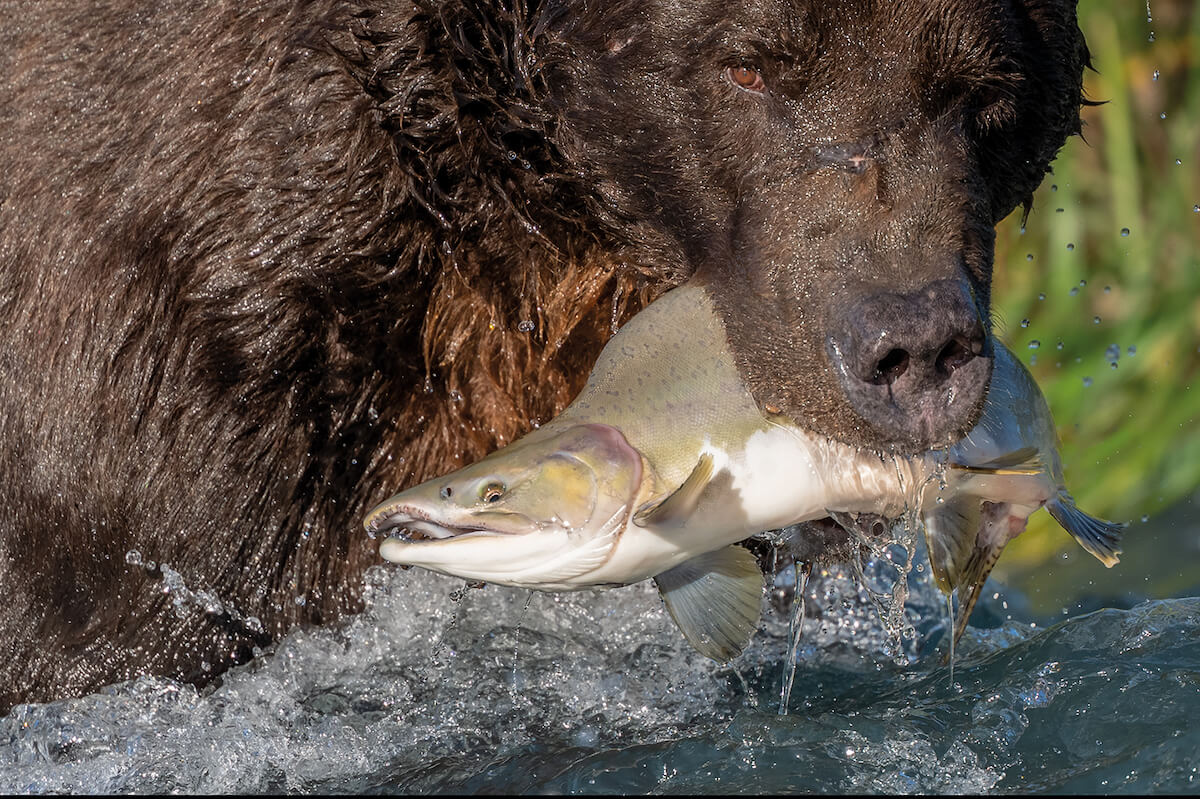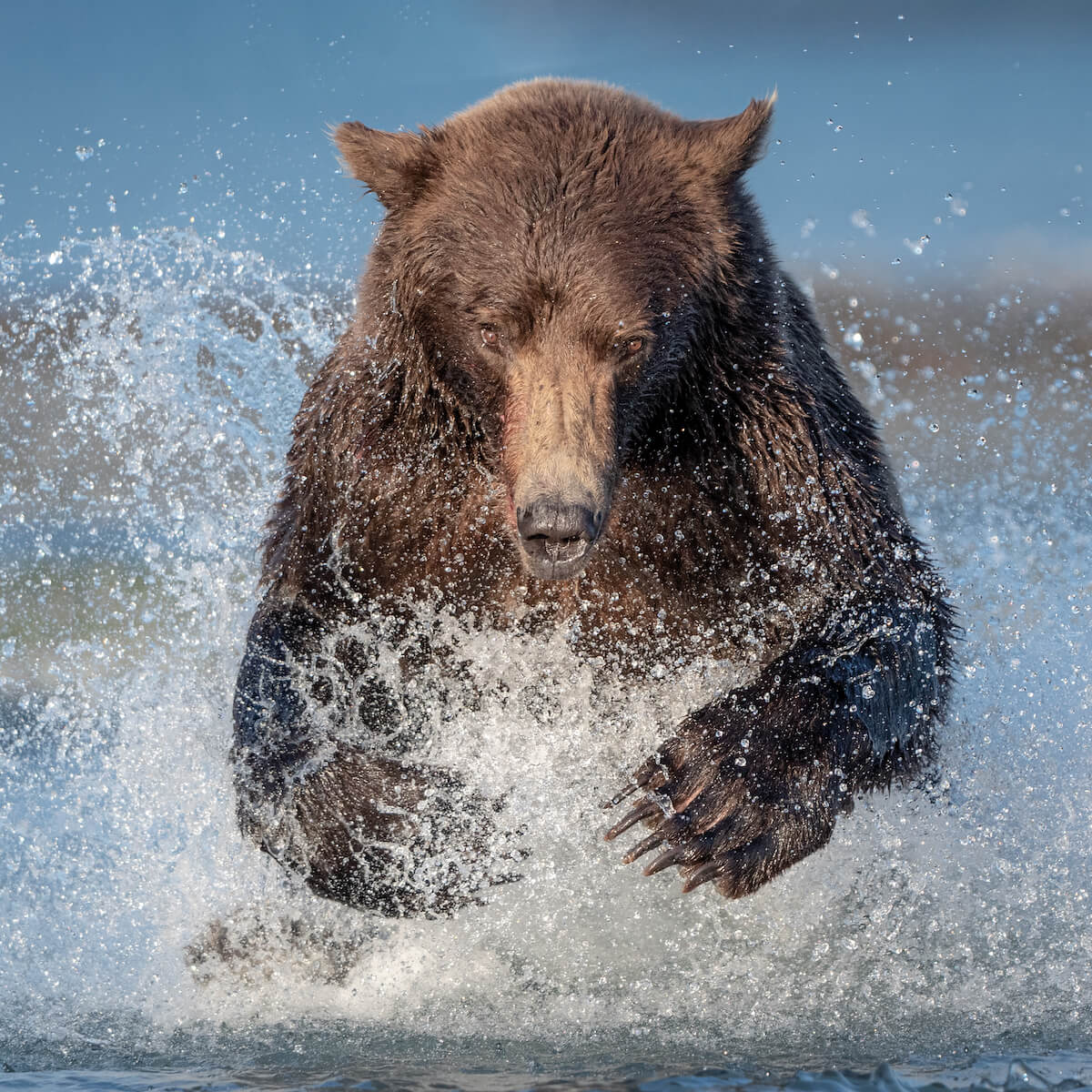 His specific tips for shooting in low light? He admits that in the dawn twilight, it can be difficult to get a clean sharp shot. Firstly, the lens needs to be set to its widest aperture, to let in the maximum amount of light. Then ideally, he recommends, set a fast enough shutter speed to freeze the movement of the bear and avoid camera shake, and also set an ISO setting that doesn’t produce too much noise. However, if the light is very low, he says you will have to compromise on both these numbers. In Alaska he ended up with 1/320 sec and ISO 25,600, the highest ISO that he dares use with his Nikon D5. With such high ISOs, the images needed a careful noise reduction in post-processing.