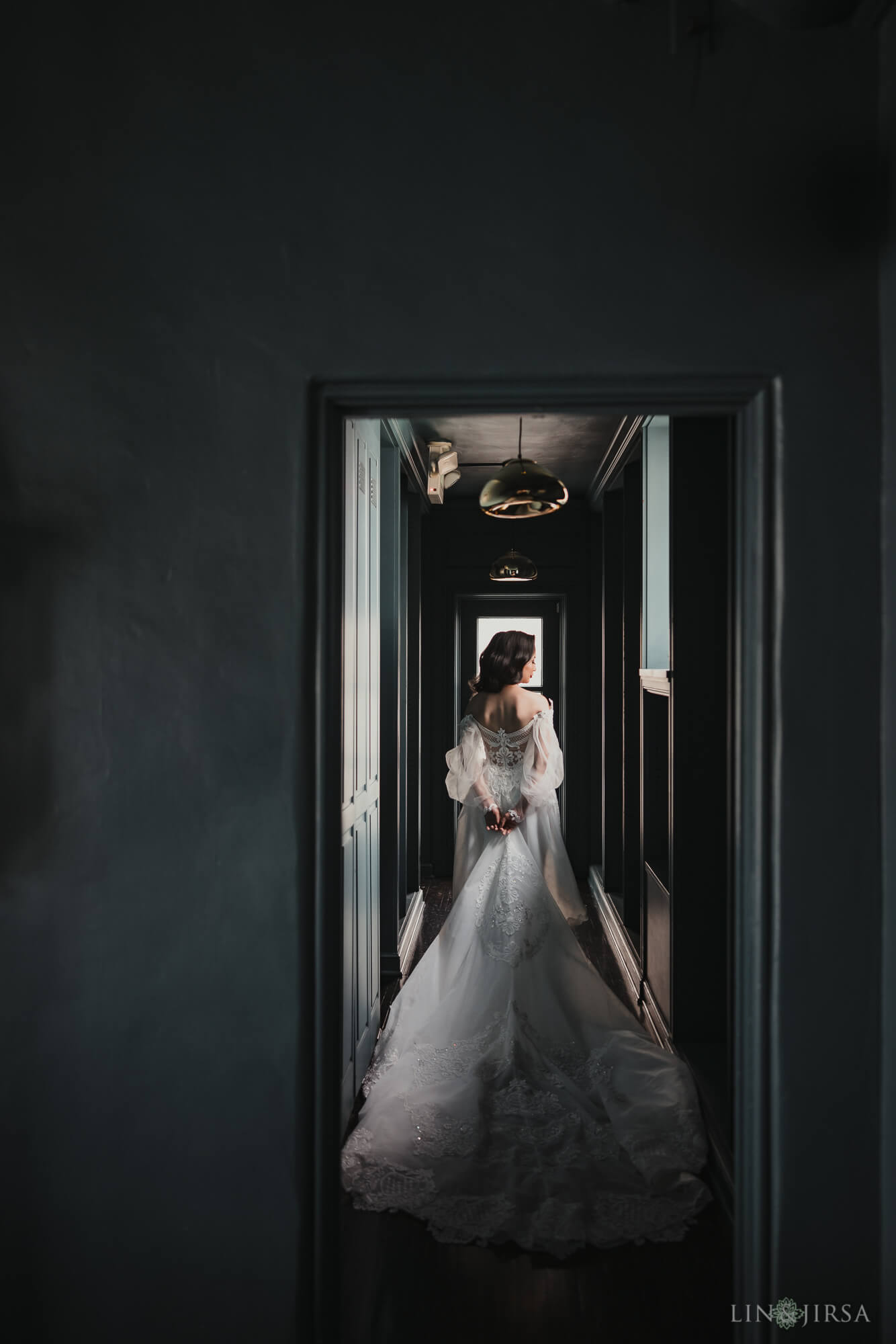 I also used a couple other spots in this location. In one shot, I changed position to use the doorway as a backlight and create a silhouette. In another shot, I used the hallway just to the side of the main room. For this shot, I positioned the bride next to a window in the hallway to light her face, and I framed her head inside a window frame at the end of the hall.