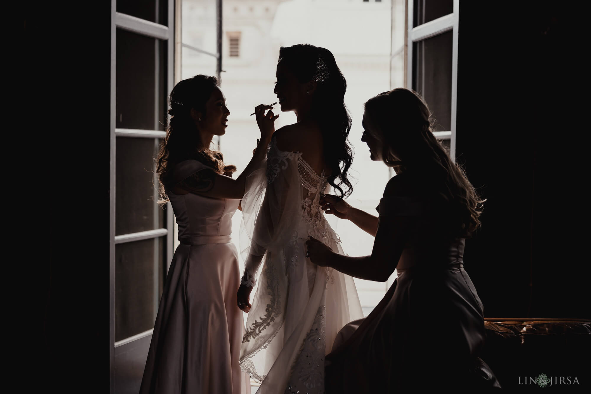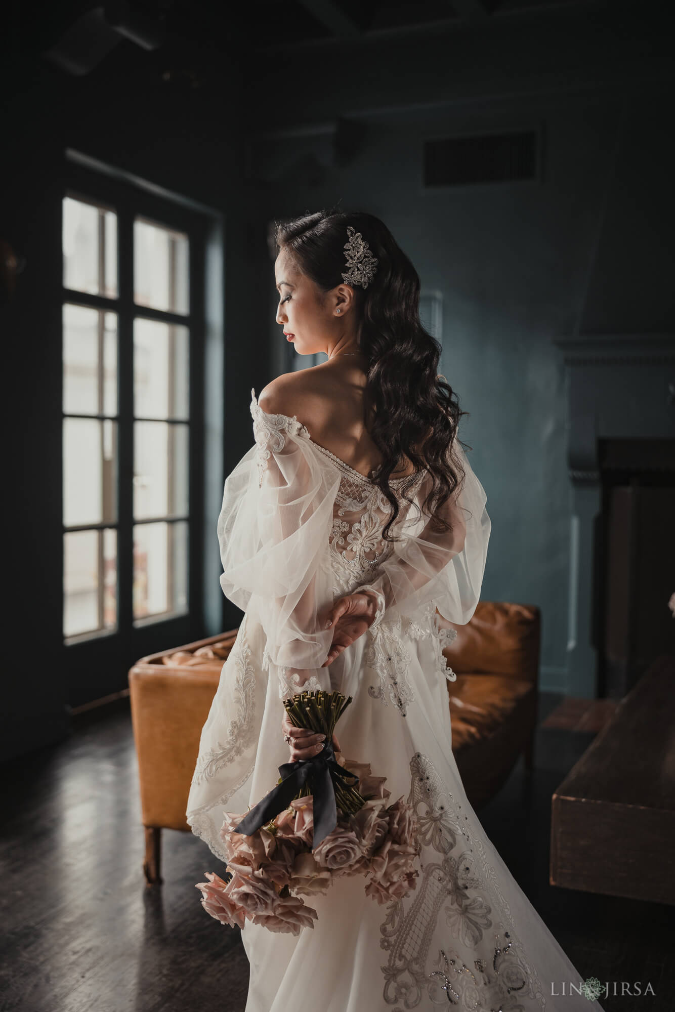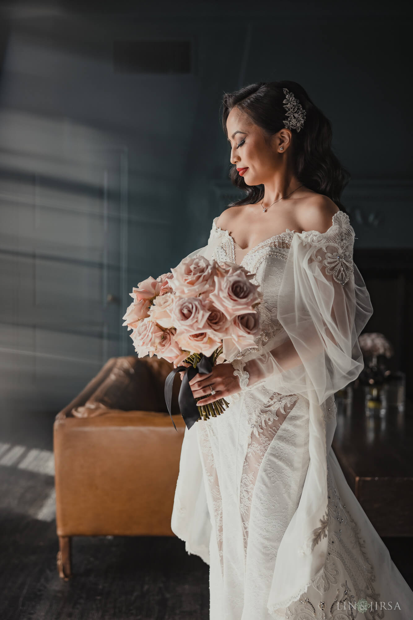 I’m sharing bridal portraits that I captured during bridal prep at Vibiana, one of my favorite venues in downtown Los Angeles. The designated room for prep at this particular location, with its deep blue walls and dark flooring, lends itself well to dark & moody portraits. I knew I wanted to take advantage of that setting for these bridal portraits. Moreover, the main room features a double-door entryway to the patio, which serves as an excellent lightsource with both doors swung wide open. I knew I could use this location to light both the bride and her bridal party using only ambient light, and the dark backdrop would serve my needs in creating moody bridal portraits. Armed with a Canon RF 28-70mm f/2, I had the range I’d need to fit everyone into the frame and a wide enough aperture to help separate them from the background.