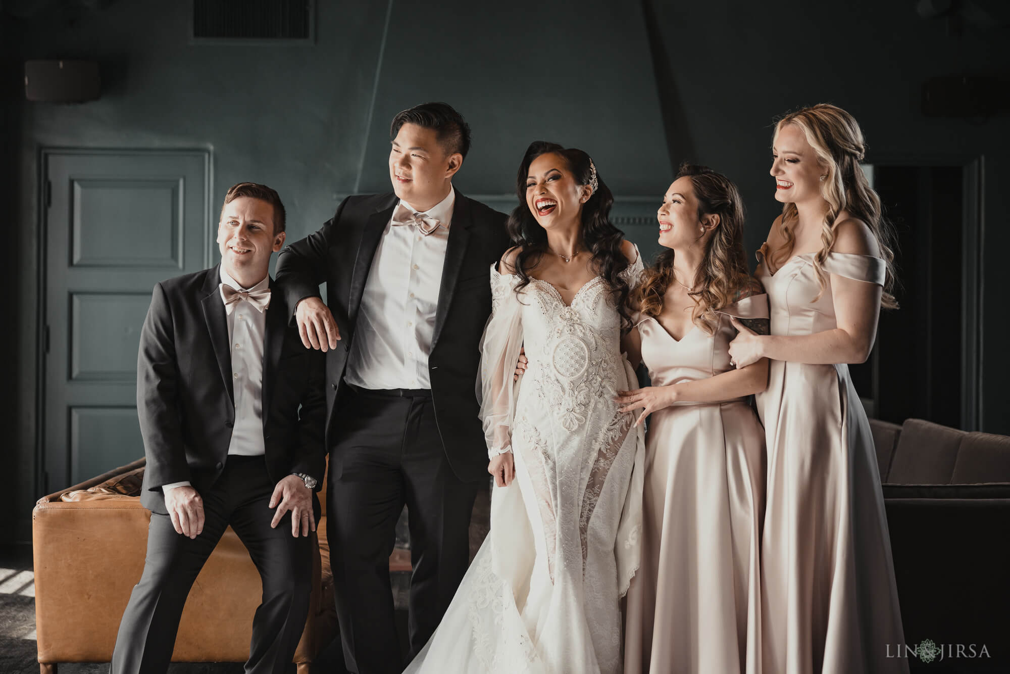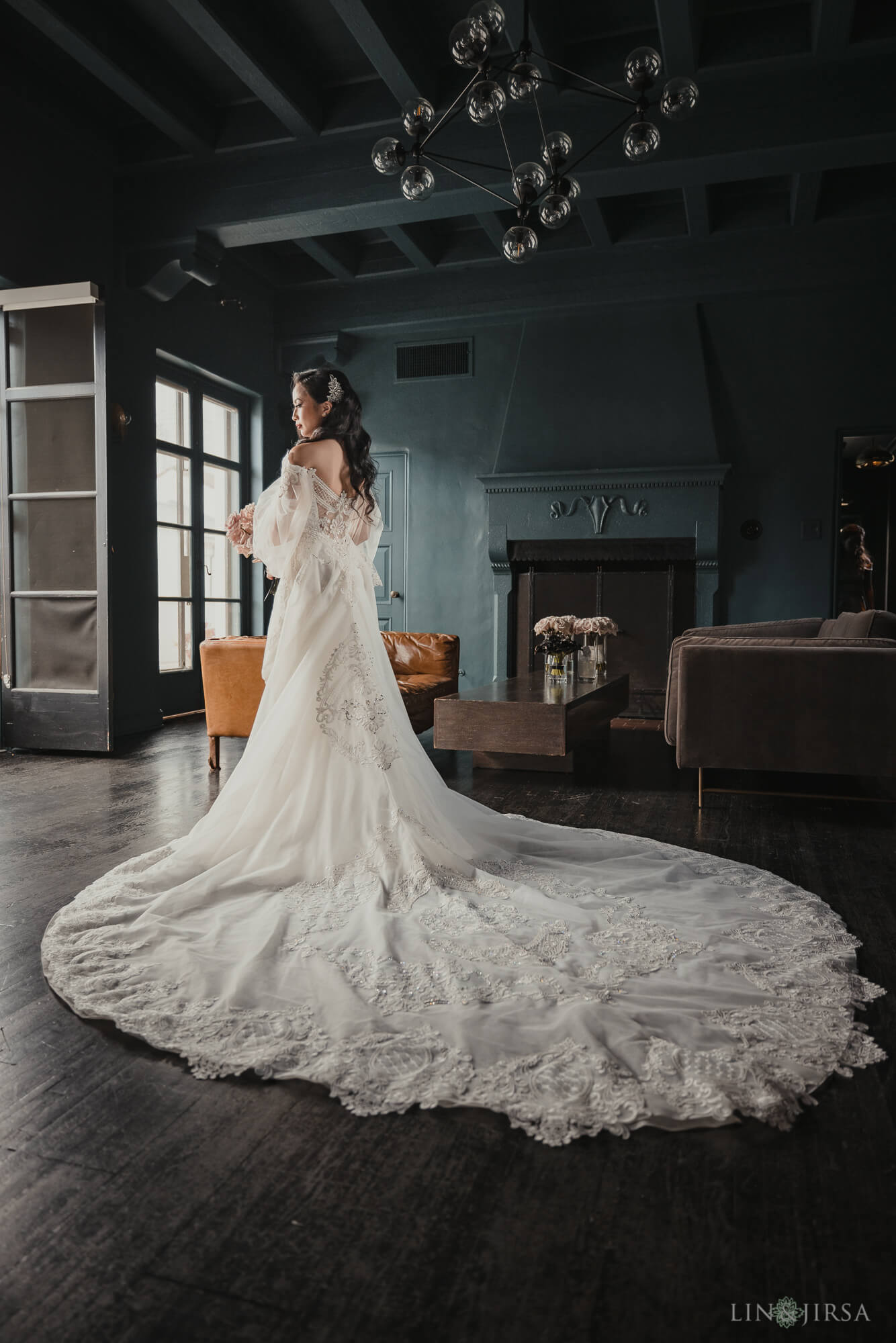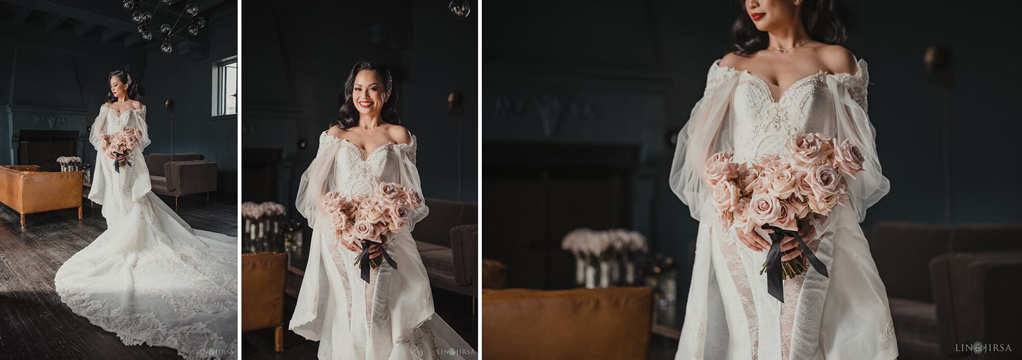 I’m sharing bridal portraits that I captured during bridal prep at Vibiana, one of my favorite venues in downtown Los Angeles. The designated room for prep at this particular location, with its deep blue walls and dark flooring, lends itself well to dark & moody portraits. I knew I wanted to take advantage of that setting for these bridal portraits. Moreover, the main room features a double-door entryway to the patio, which serves as an excellent lightsource with both doors swung wide open. I knew I could use this location to light both the bride and her bridal party using only ambient light, and the dark backdrop would serve my needs in creating moody bridal portraits. Armed with a Canon RF 28-70mm f/2, I had the range I’d need to fit everyone into the frame and a wide enough aperture to help separate them from the background.
