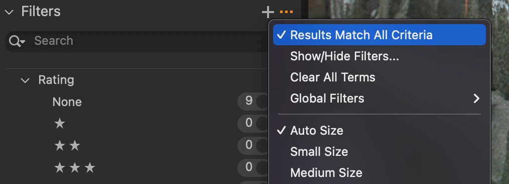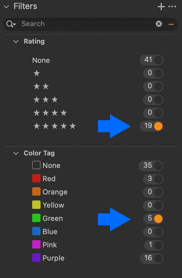 For example, you can filter images by rating and color tag. Or add some keywords to the search. BTW, in Filters preferences, you can set the rule for the multiple criteria search: