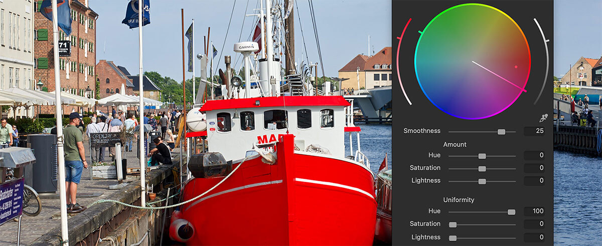 Simply mask the object you would like to adjust. Next, select the whole color wheel in Skin Tone and set Hue Uniformity to 100.
