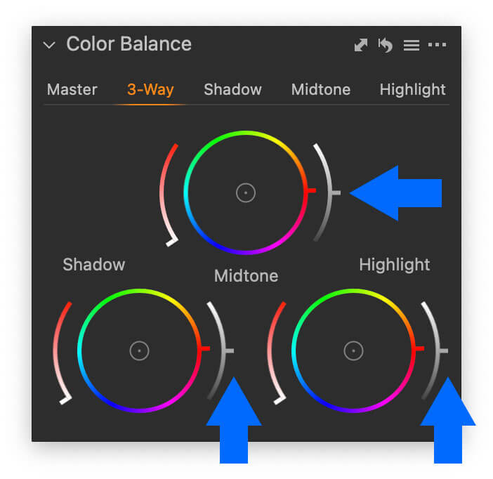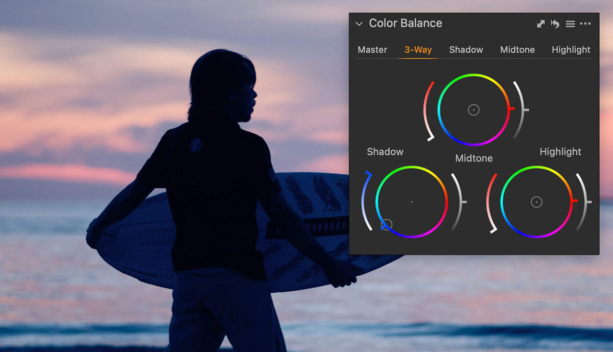 Color Balance has separate brightness sliders for Shadow, Midtone, and Highlight.