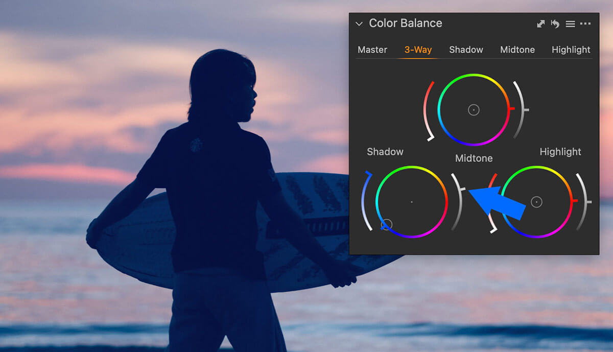 Now, you’re free to choose a tool to use. You can easily make this area warmer by increasing WB temperature or applying some color toning with Color Balance: