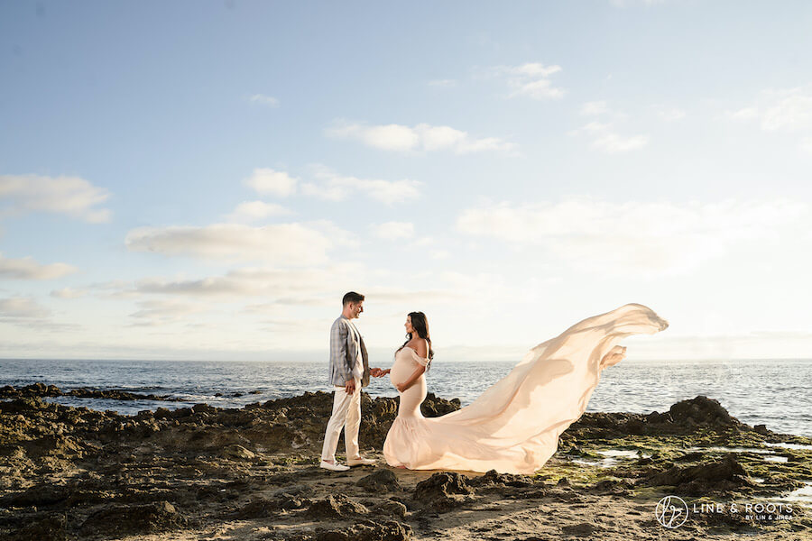 For this reason, encourage the model to wear whatever she feels best in, even if that means sweatpants and a baggy shirt. Some photographers prefer tight maternity clothes since they reveal the baby bump more clearly, but really, you can get great shots with any outfit. If the model’s wearing loose clothes, you can simply ask her to cradle her abdomen or face against the wind.