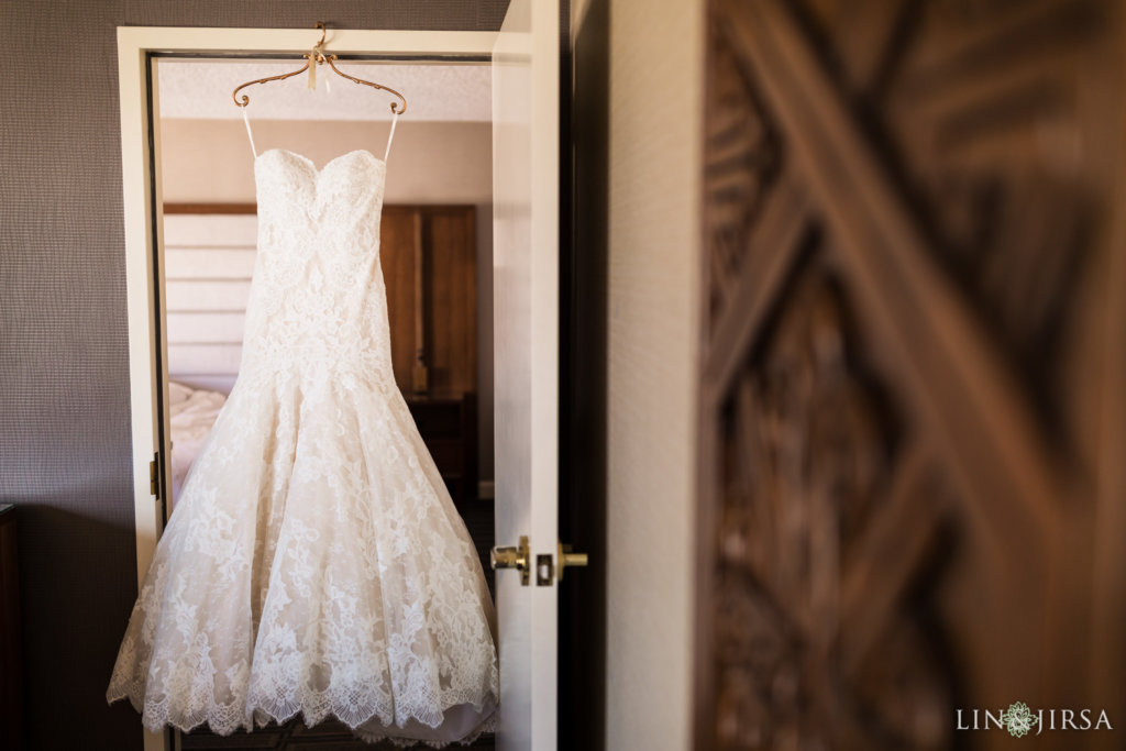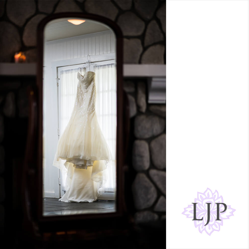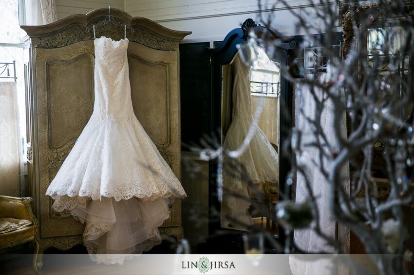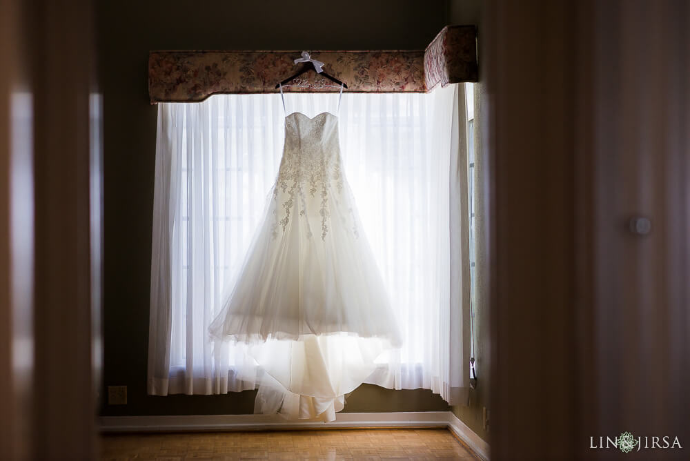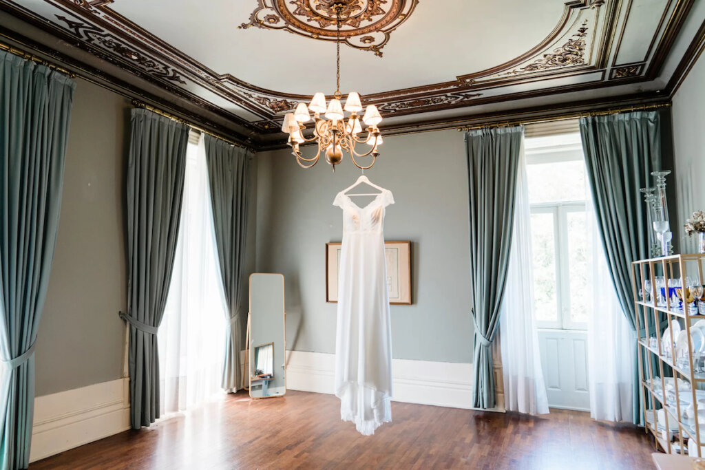 If the wedding venue has incredible views, consider hanging the dress, opening the curtains and showing off the beautiful scenery. Of course since the outside lighting is likely brighter than the inside of the room, you might need to add flash photography or consider an HDR photo.