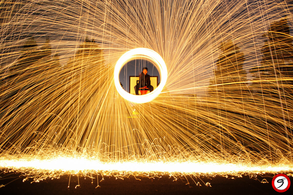 It involves using a long exposure to capture the motion of hot embers flying through the air. It is achieved by setting fire to a material called steel wool that is sitting inside a metal whisk which is attached to a chain and then spinning it. Once alight and spun around, the glowing hot embers fly out and create orange/gold streaks of light which is captured. The effect that is produced is somewhat similar to the effect created by a Catherine Wheel firework. This technique produces eye-catching images and makes an interesting experience. The beauty of it is that no photo looks the same and it is open to be experimented with to create unique photos.