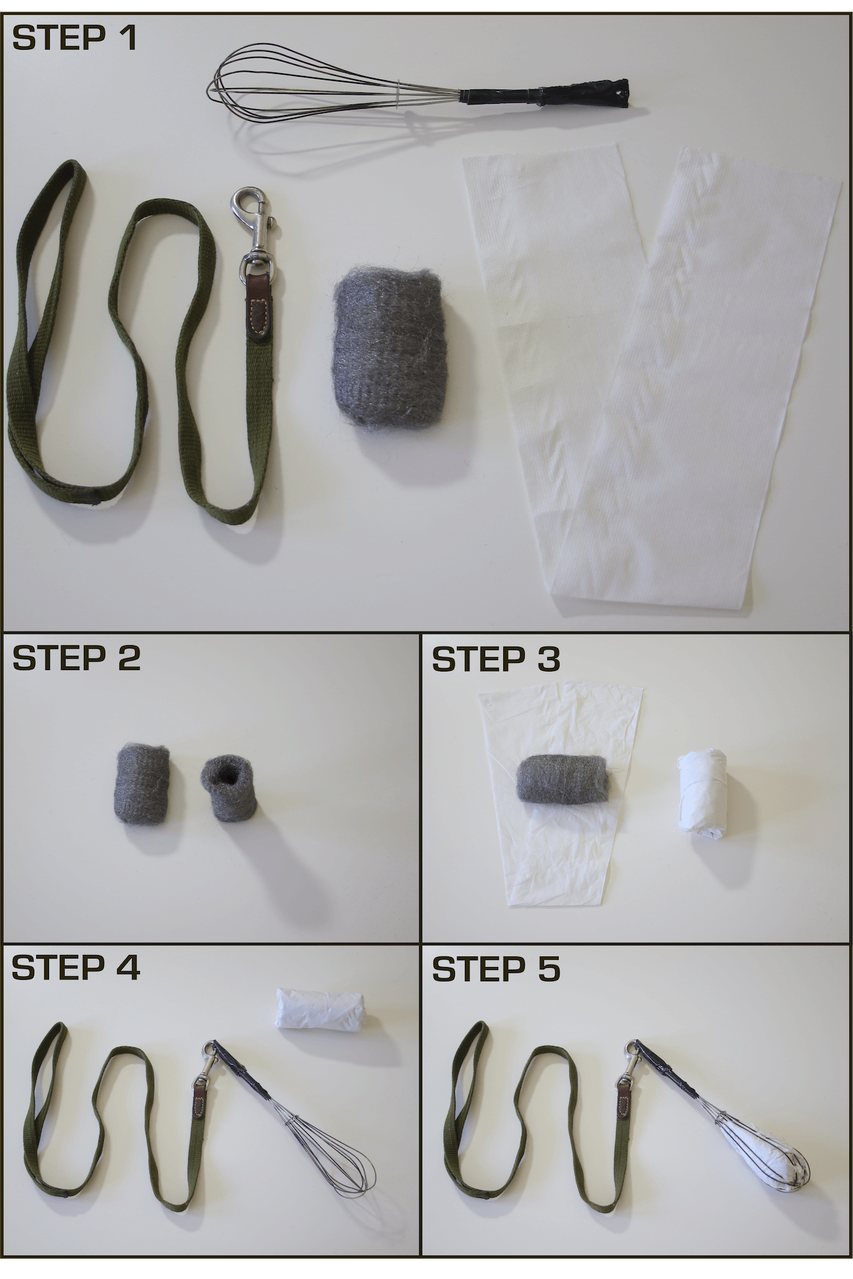 - Step 4 – Use the clasp on your dog lead to attach it to the loop at the end of your whisk. Step 5 – Take the steel wool wrapped in toilet paper and put it inside the whisk.