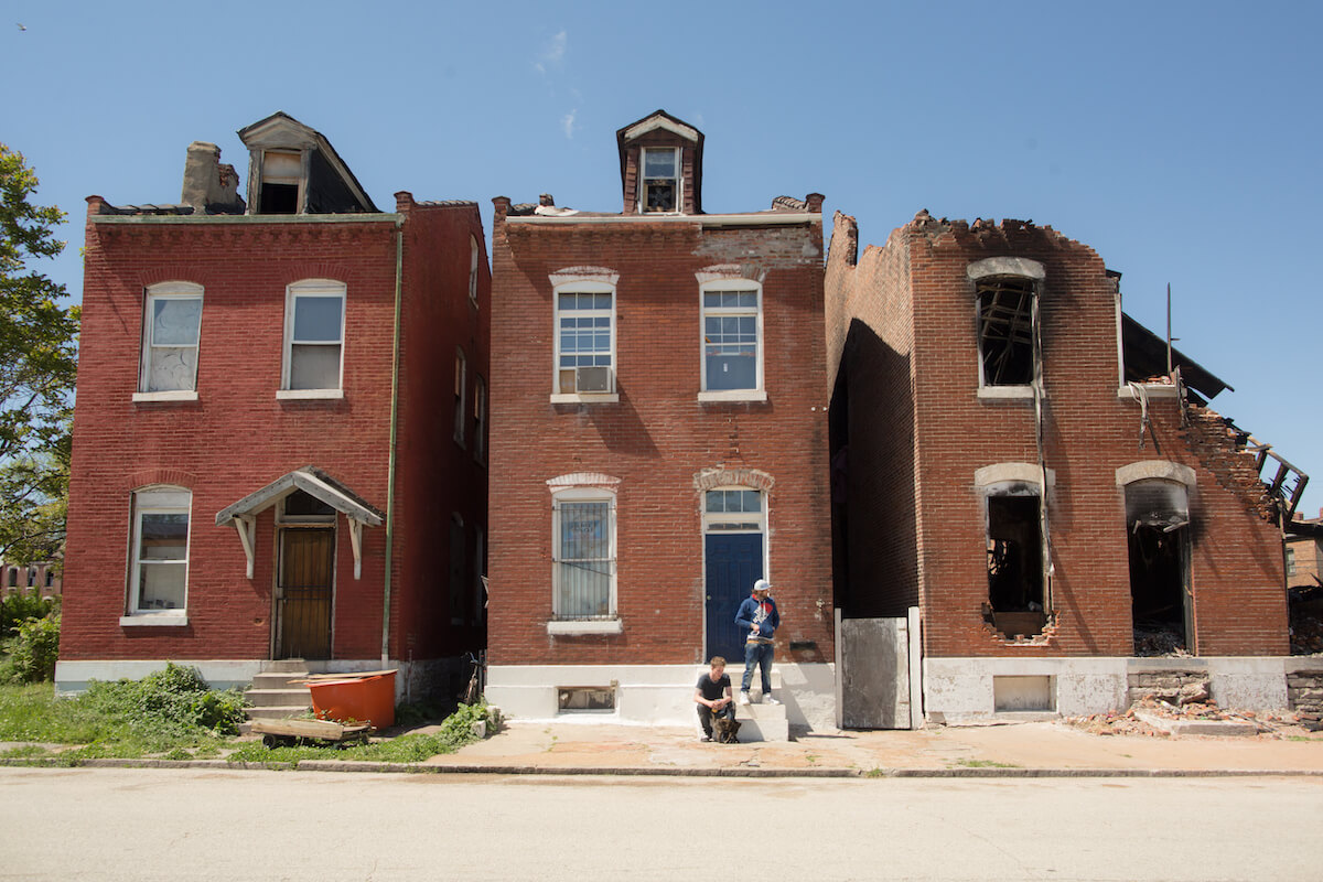 Of the non-people photos, I like the shot of the burned out building aside the reclaimed building in eastern Saint Louis, Missouri (IMG_5956). It includes the two men who are living in the non-burned building, with whom I spoke at some length.