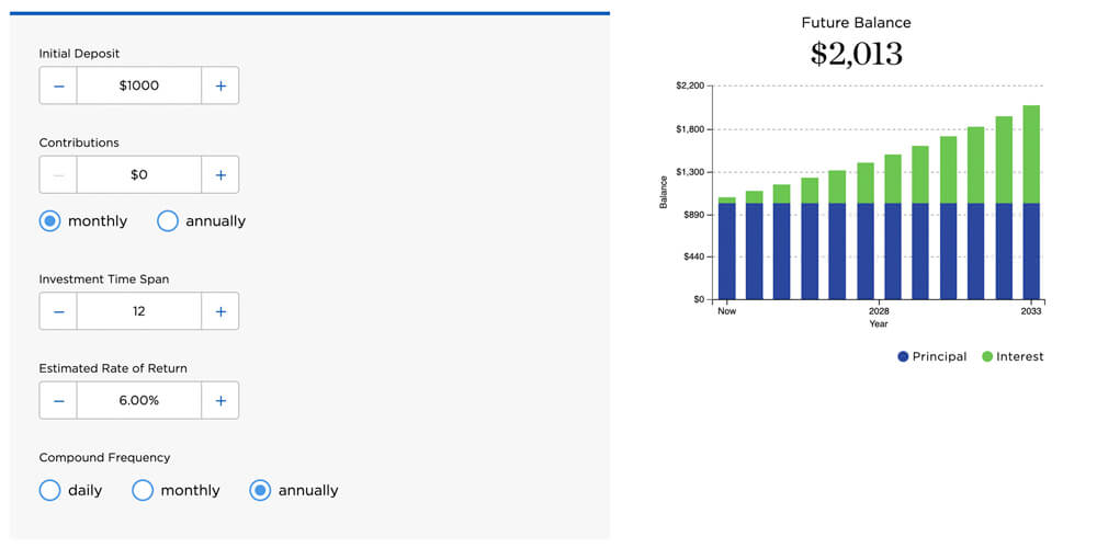 As a general rule of thumb, you can double your money every 12 years at an average of 6% return, so $1,000 would become $2013. With more frequent contributions and/or a higher rate of return, which is likely according to historical data of stocks and real estate, you can see how the return can be even higher than that.