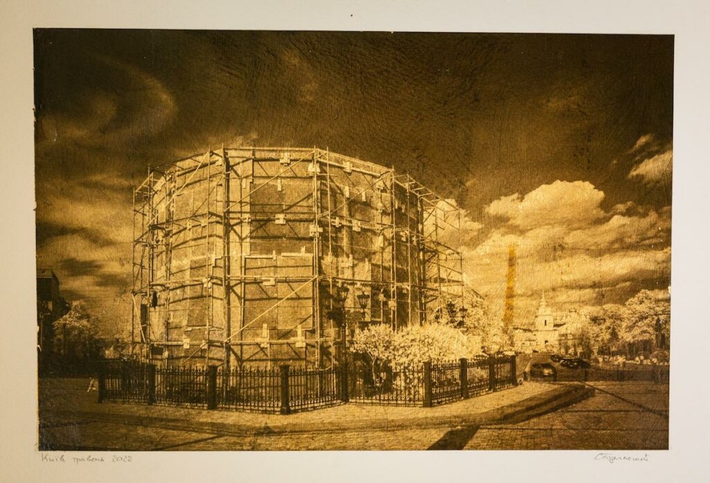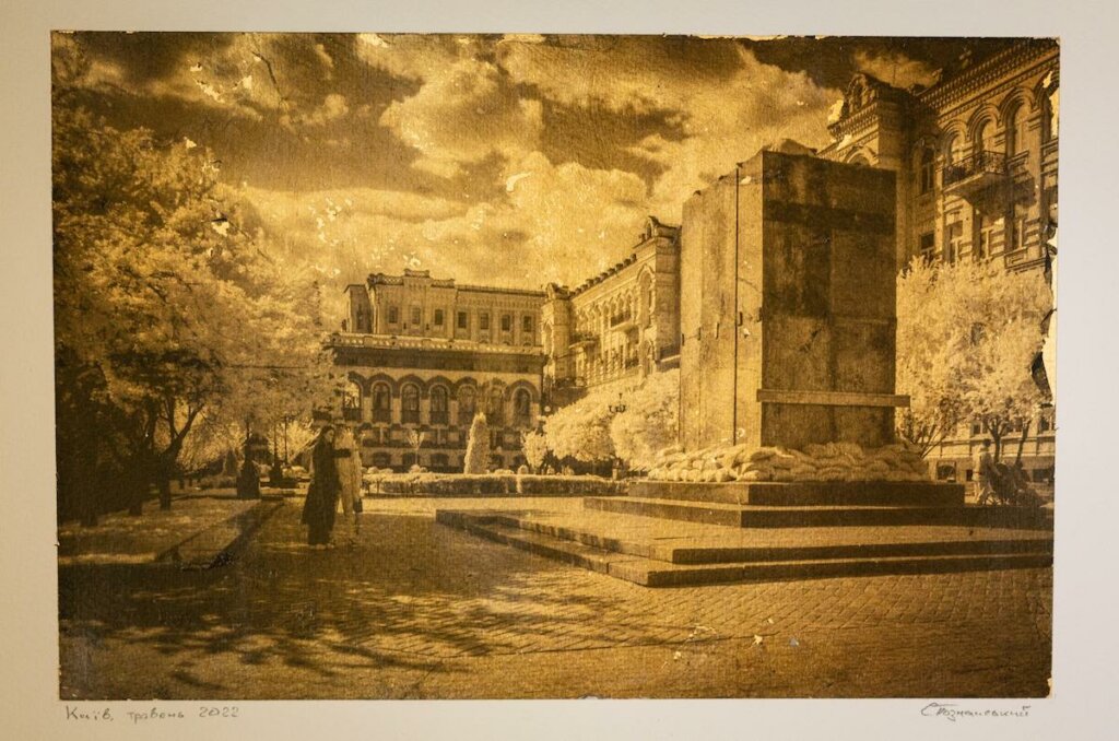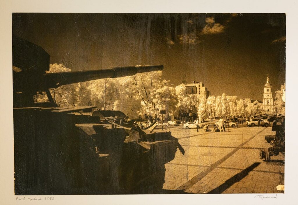 “Since the beginning of the war, the full-scale occupation of Ukraine, as a man of principles I have stayed in Kyiv. This is my favorite city, a place where I was born, where my childhood passed and here I acquired all my knowledge and skills. I knew that I can be useful here. In March, I loaded sandbags necessary for the defense of the city, and then appeared an opportunity to engage in journalistic activity. While traveling around the city and its environs, I made reports. I have seen plenty of things and realized how much the city has changed during this period. All habitual and familiar places turned into sinister and ugly forms. Anti-tank hedgehogs appeared on the streets, concrete checkpoints, sandbags became something usual and monuments became cubes and parallelepipeds. I could not stay away from the events and decided to capture the world-famous tourist places in Kyiv, through the prism of my perception. I took my camera and went to shoot. Sometimes this all was during an air raid alert and to the sound of a siren. Initially I set a goal for myself to avoid simple reporting and recording events. Therefore, my choice fell on a camera that shoots in infrared spectrum and black and white tone. This technique allowed me to enhance the already oppressive atmosphere of the city. Then I printed the photos on transfer paper, loaded with gold leaf and transferred the image to watercolor paper.”